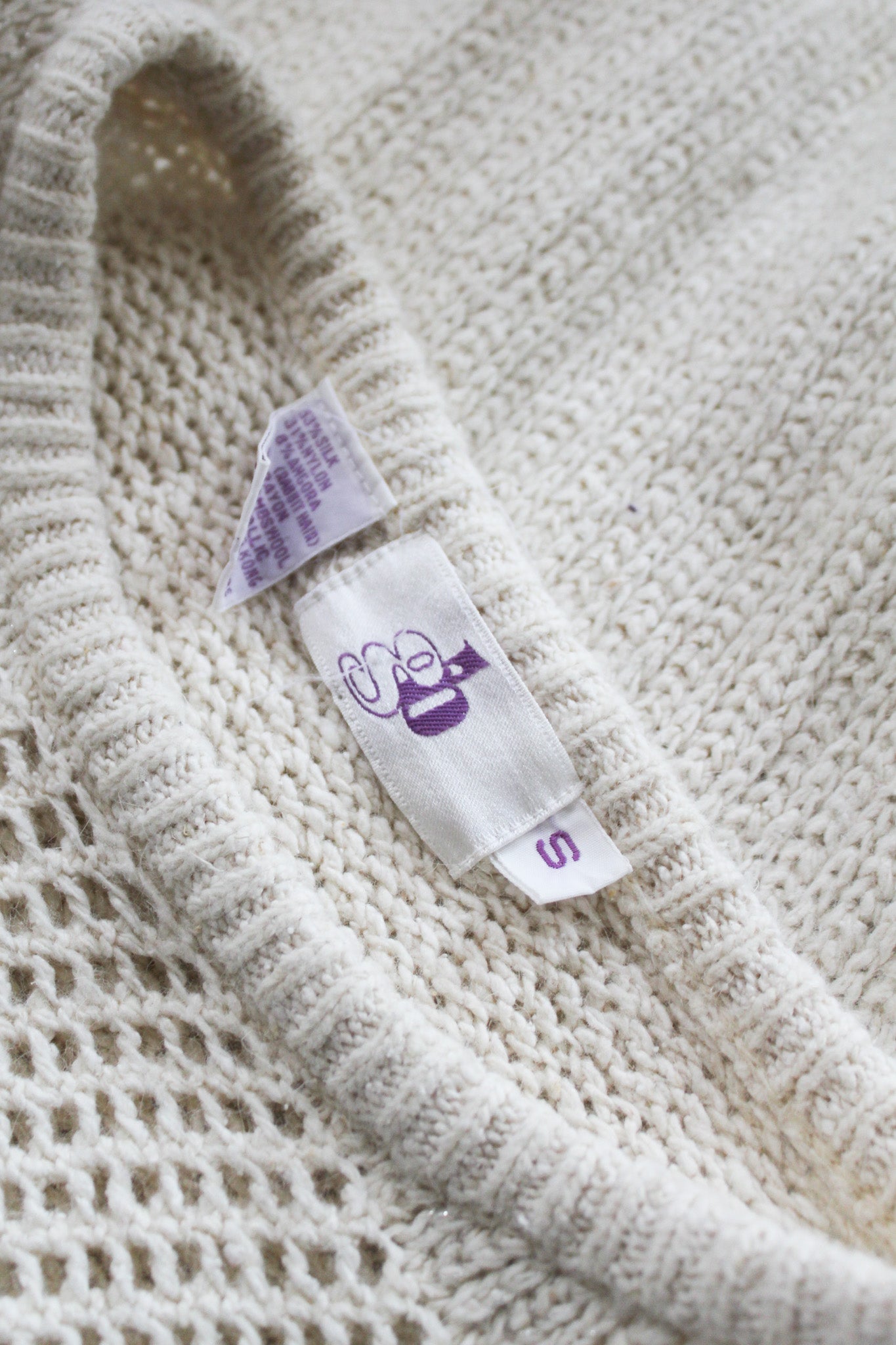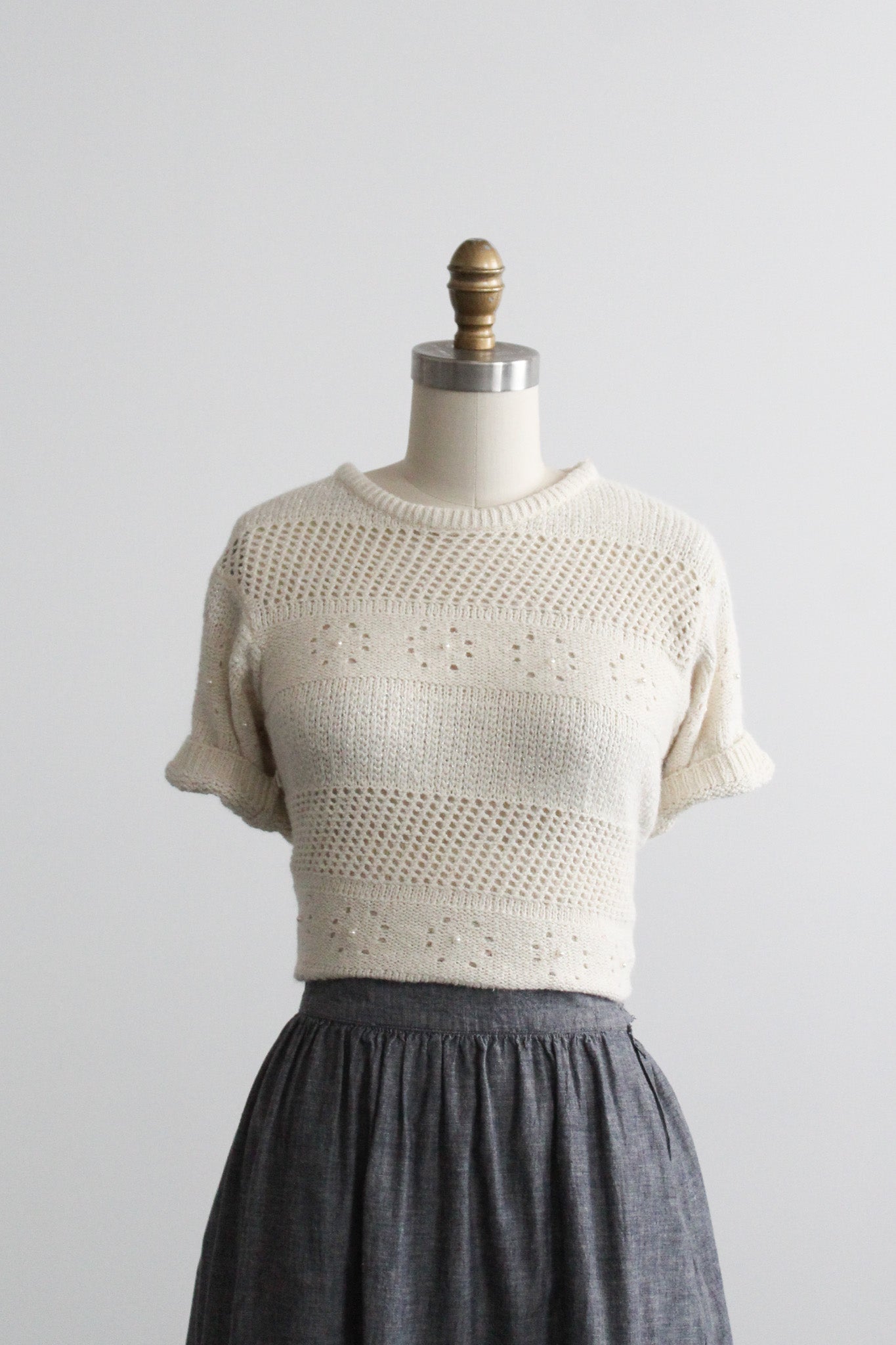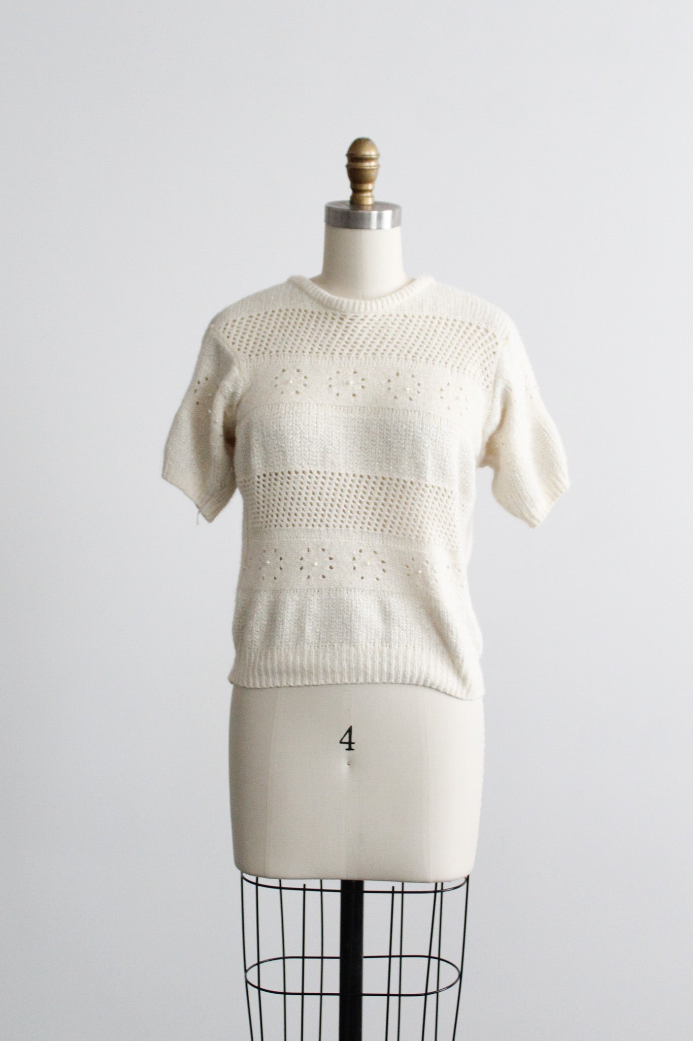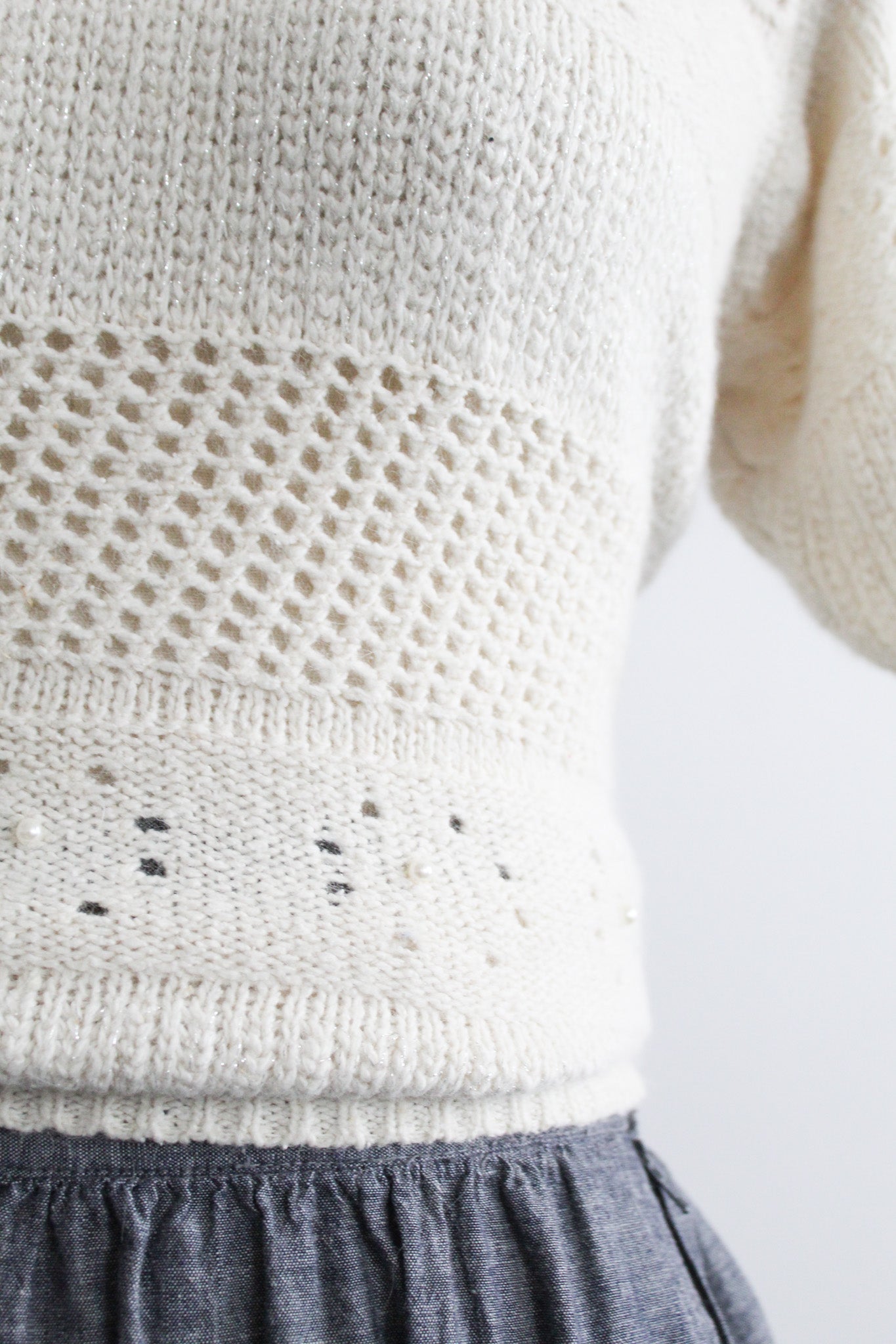 features of note: small pearly beads throughout / metallic threading / peekaboo eyelet knit