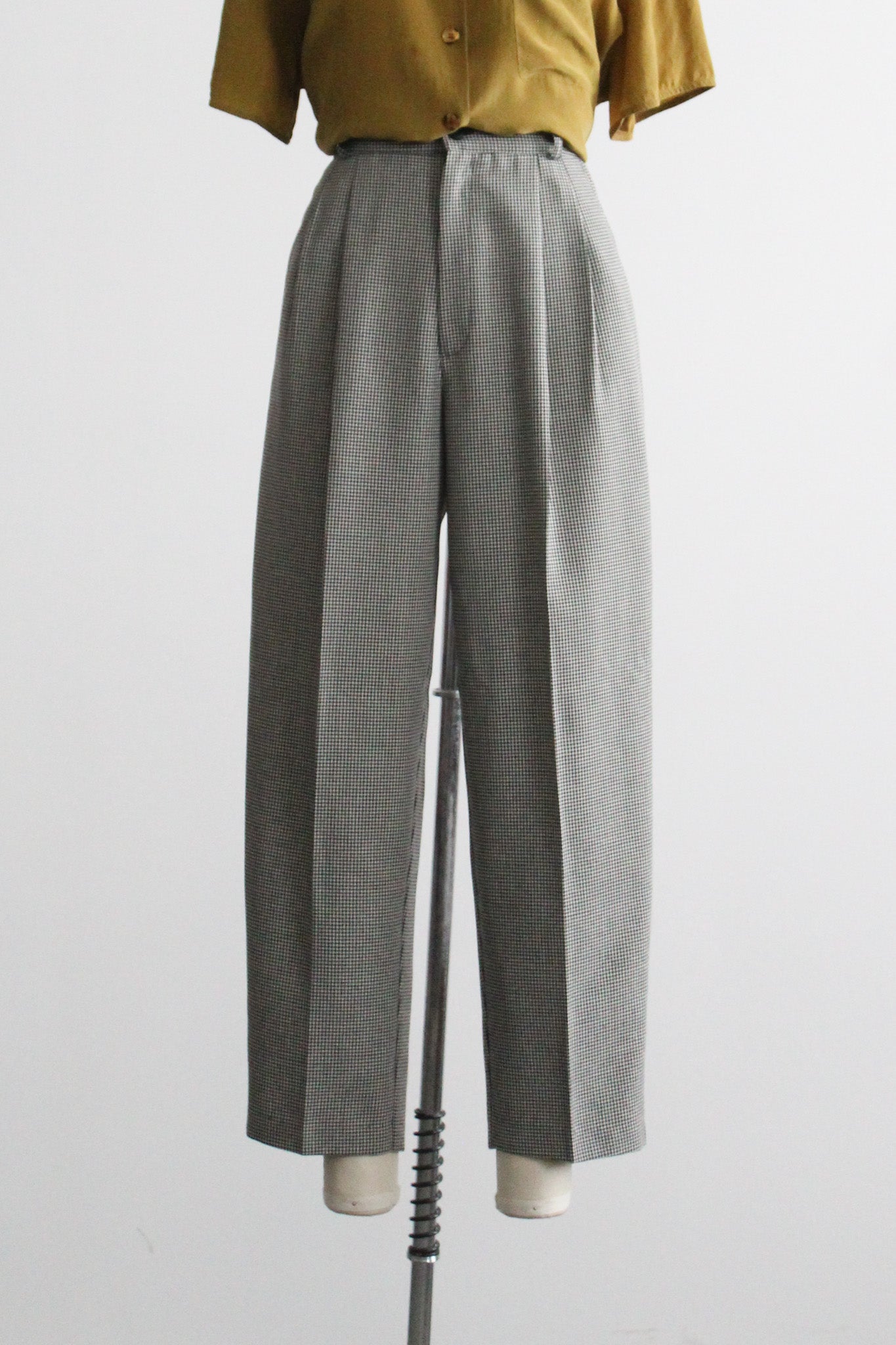 features: elastic panels at the sides of the waistline / pockets at the hip / houndstooth print / zip and button fly