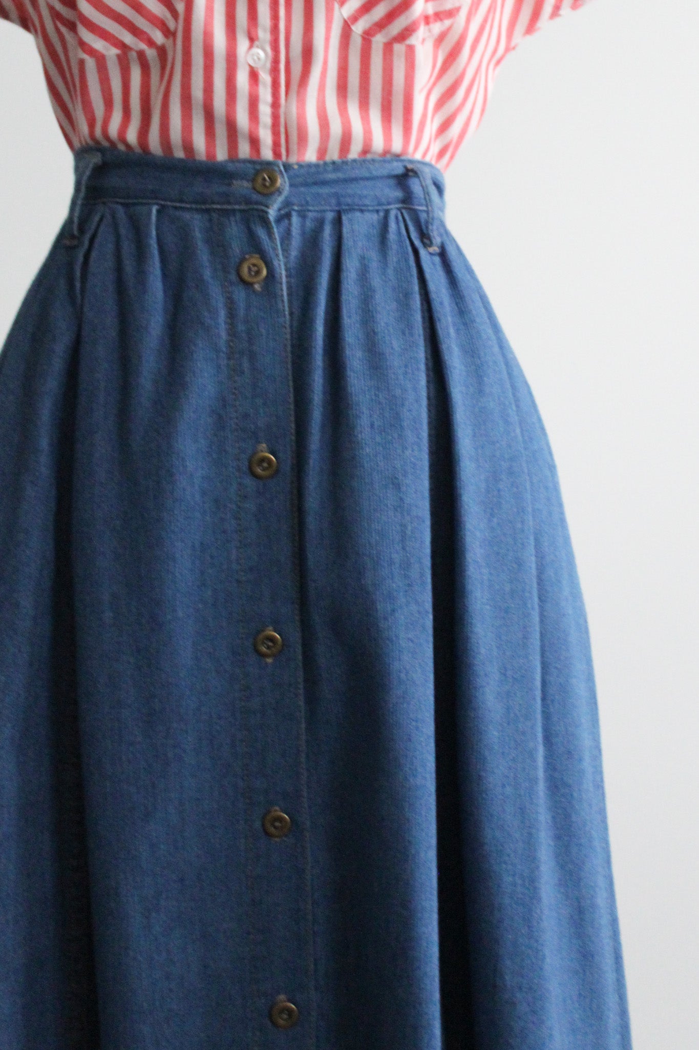 features of note: denim is lightweight and soft / buttons up the front / flared shape / pockets at the hip / elastic at the back of the waistline
