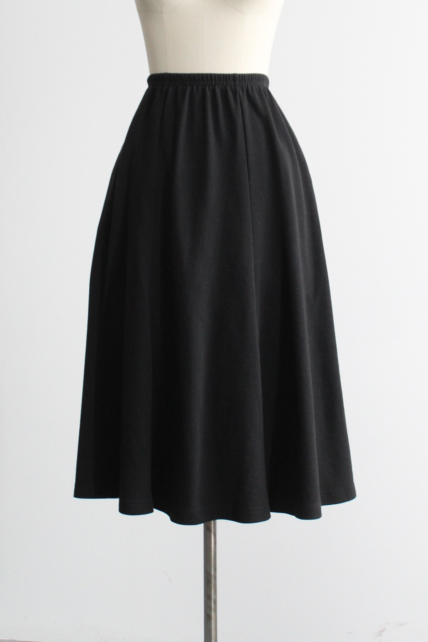 features of note: elastic waistline / pockets at the hip / flared shape / fabric feels like a soft t-shirt
