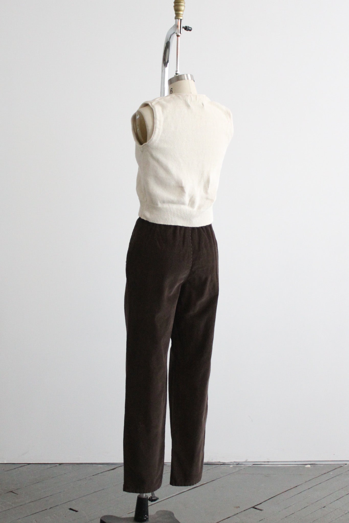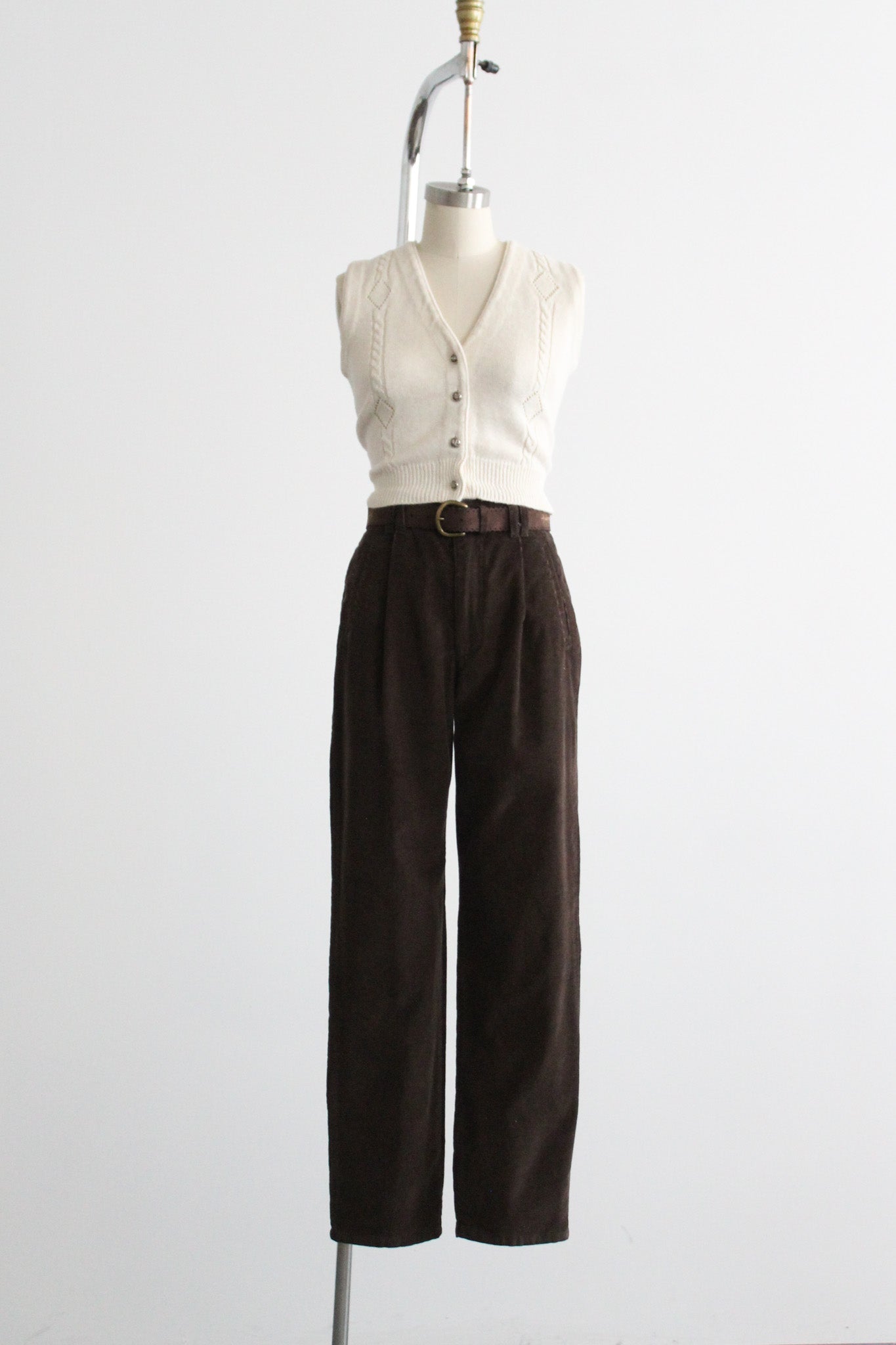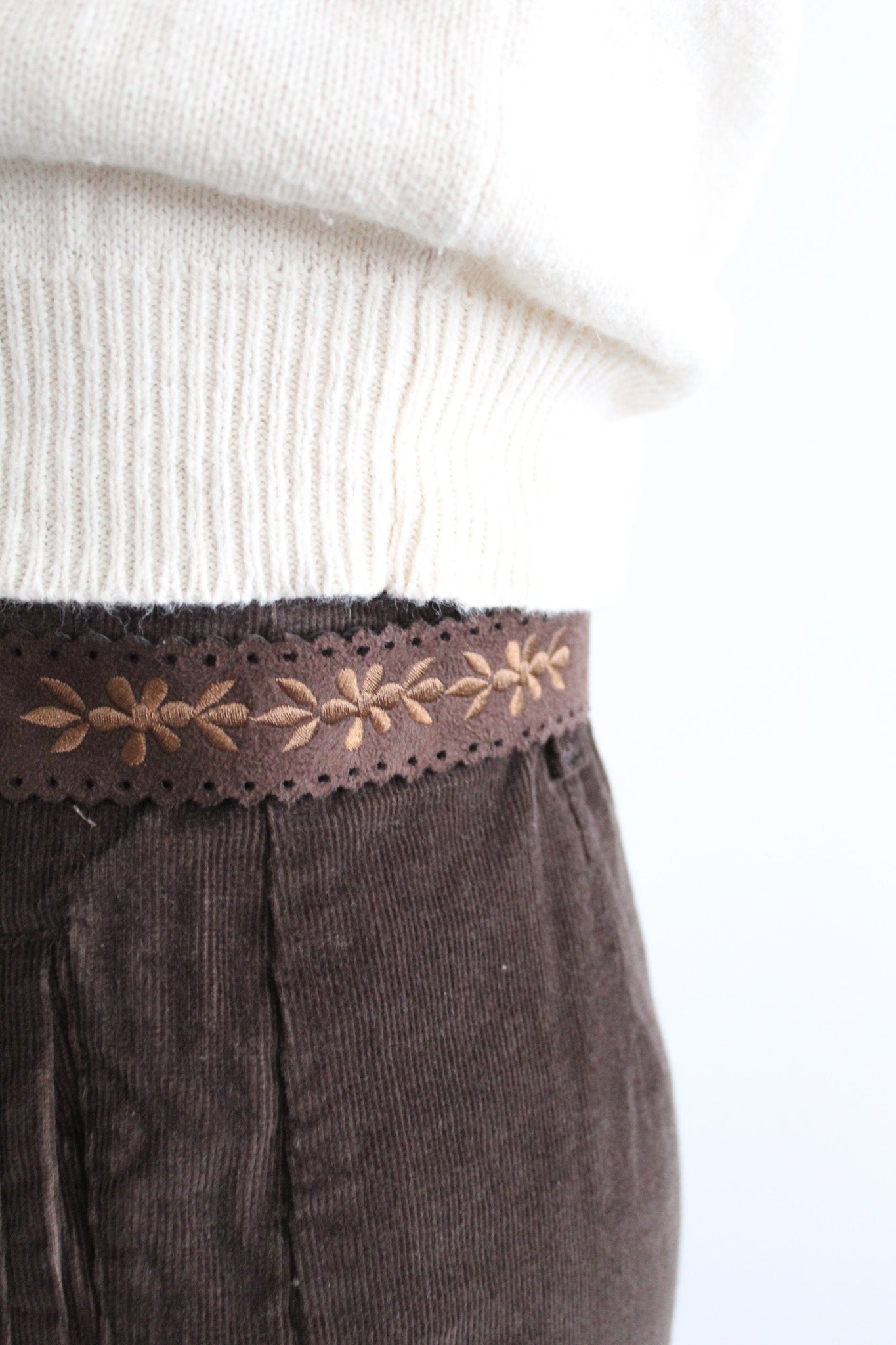 features of note: zip and button fly / straight leg / pockets at the hip / comes with a matching belt / elastic at the back of the waistline