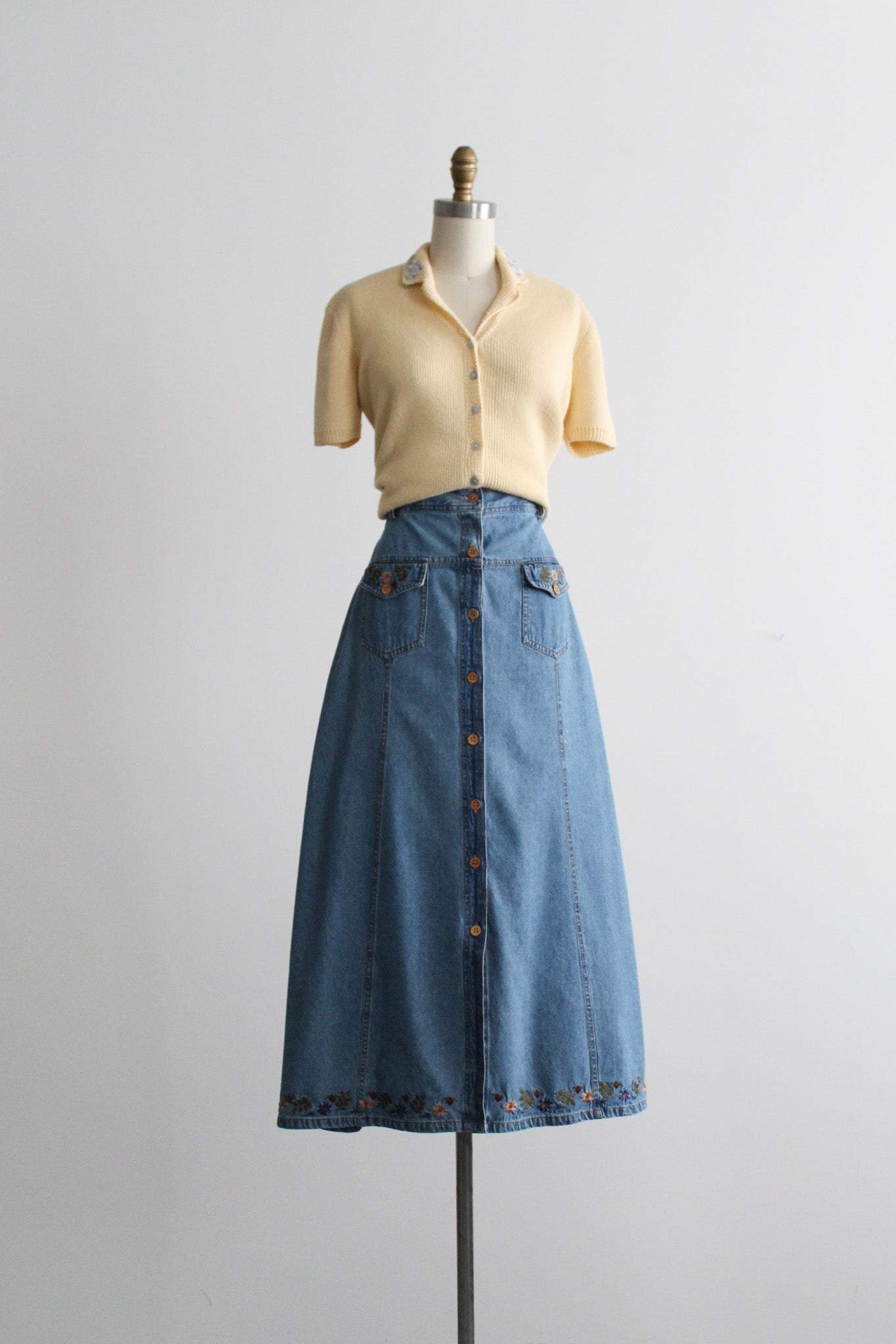 features of note: apron pockets at the front / elastic at the back of the waistline / buttons all the way up the front / embroidery at the hem and pockets