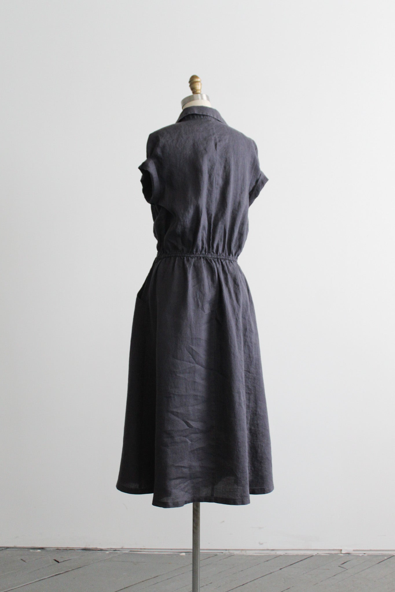 features of note: buttons up the front / elastic waistline / pockets at the hip