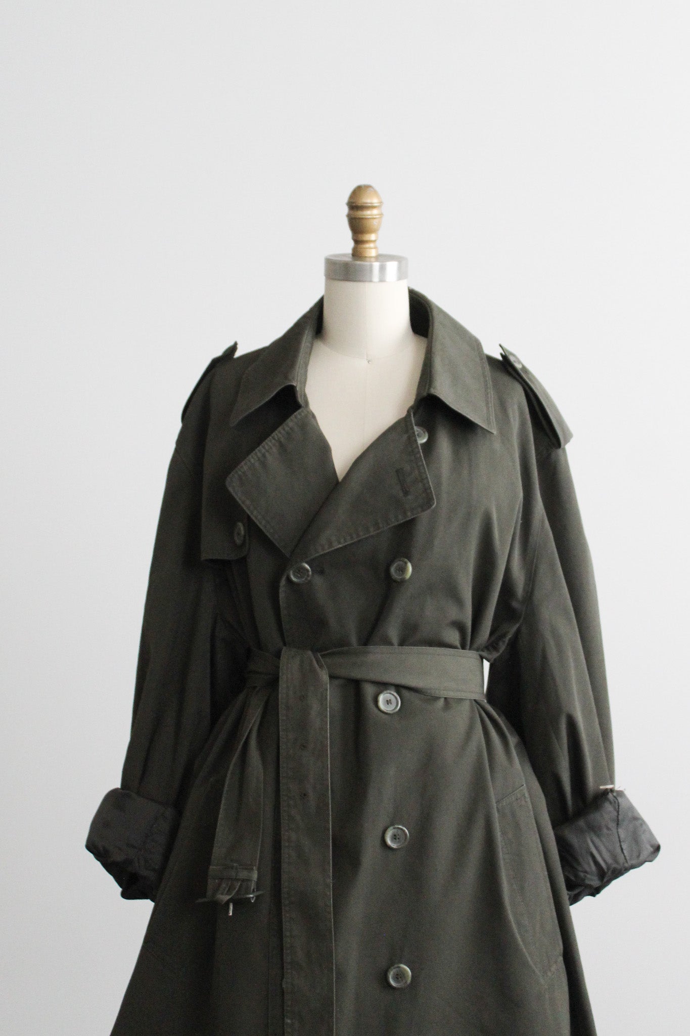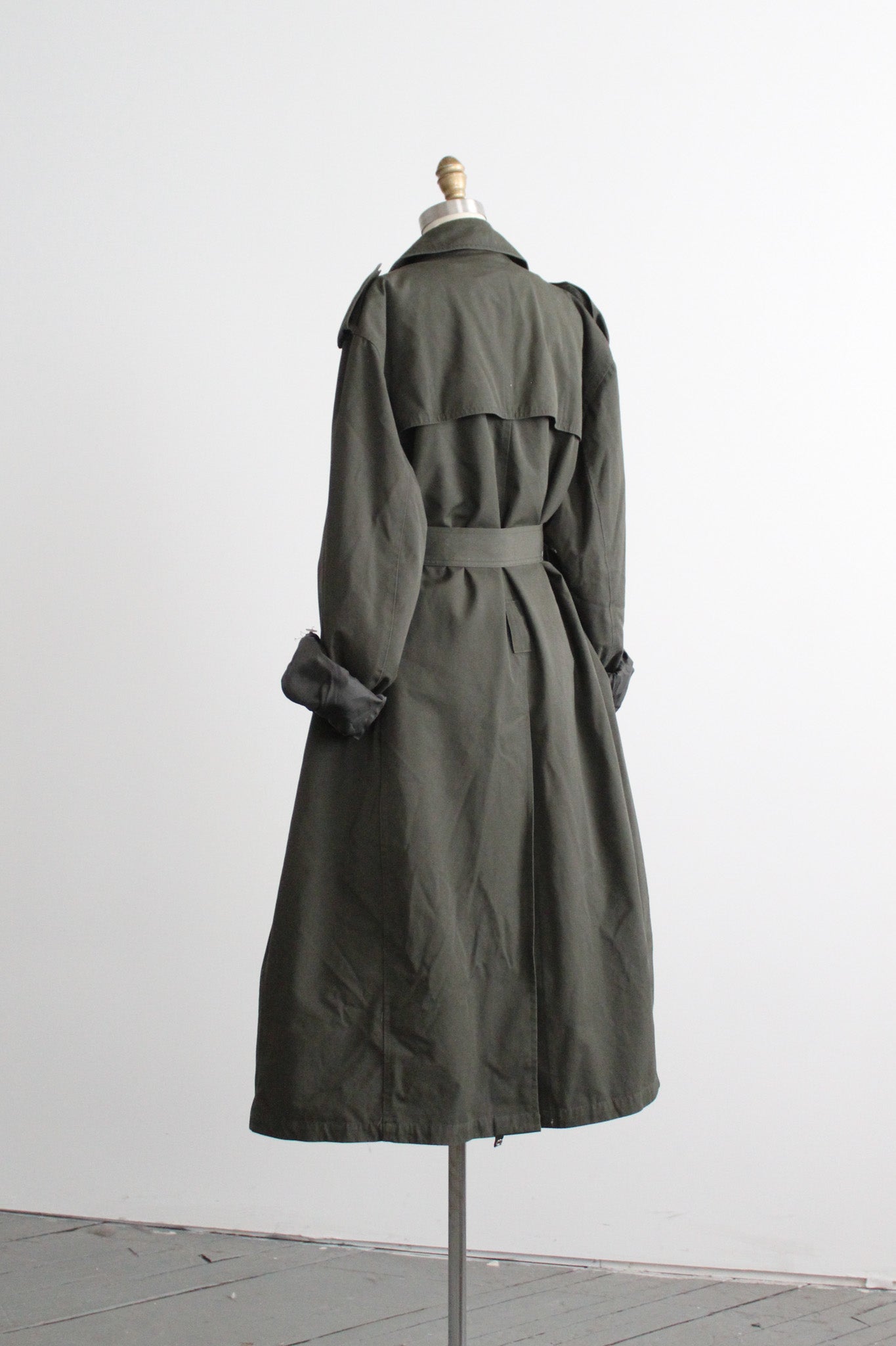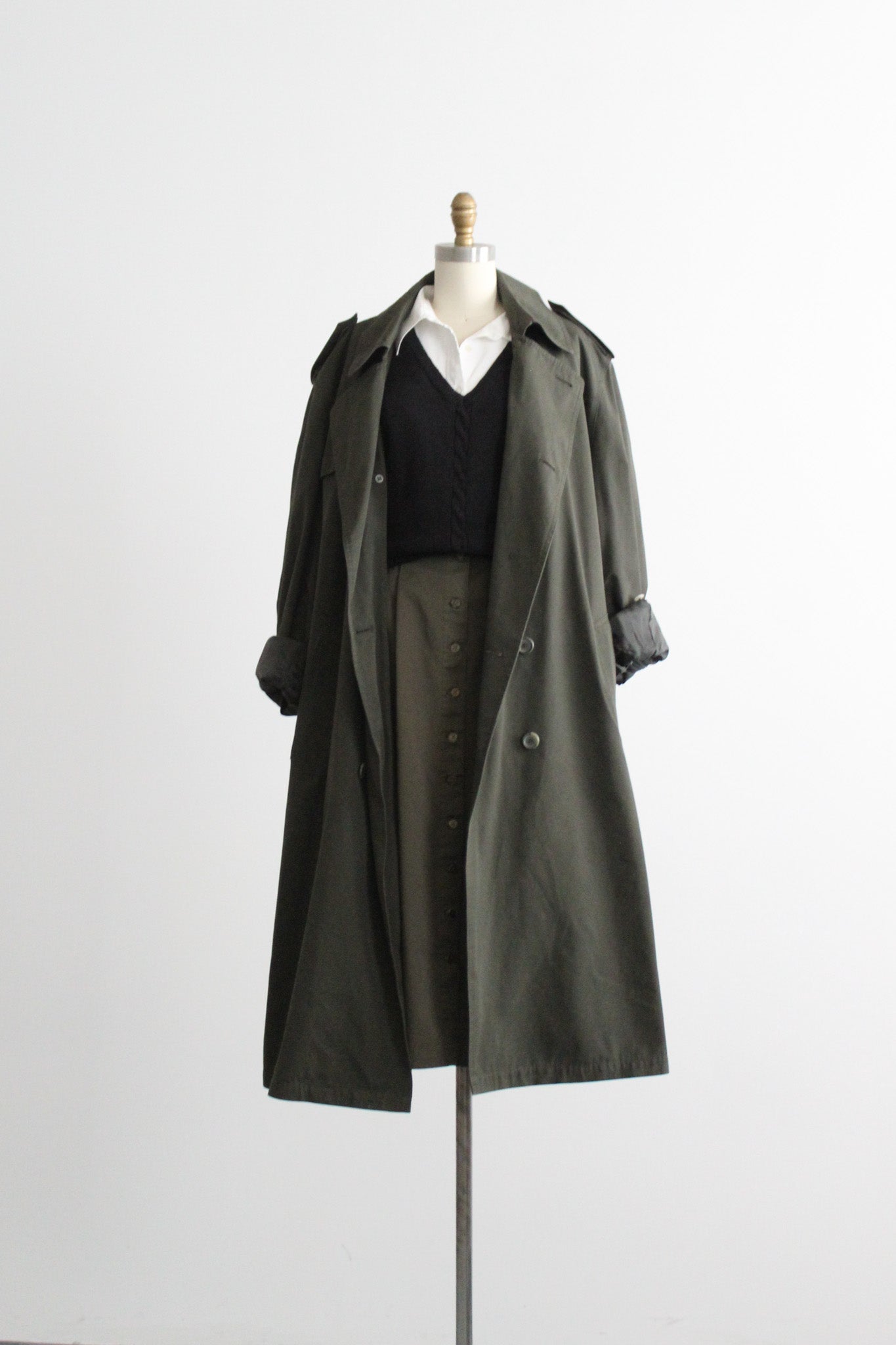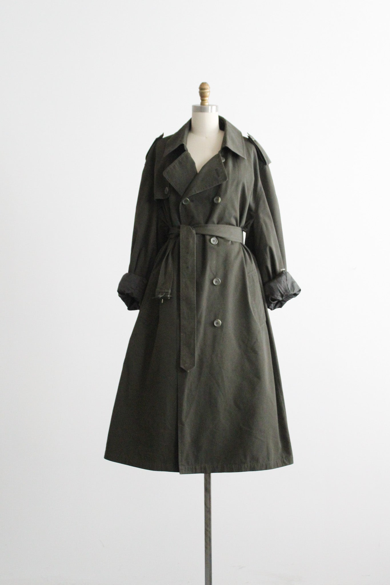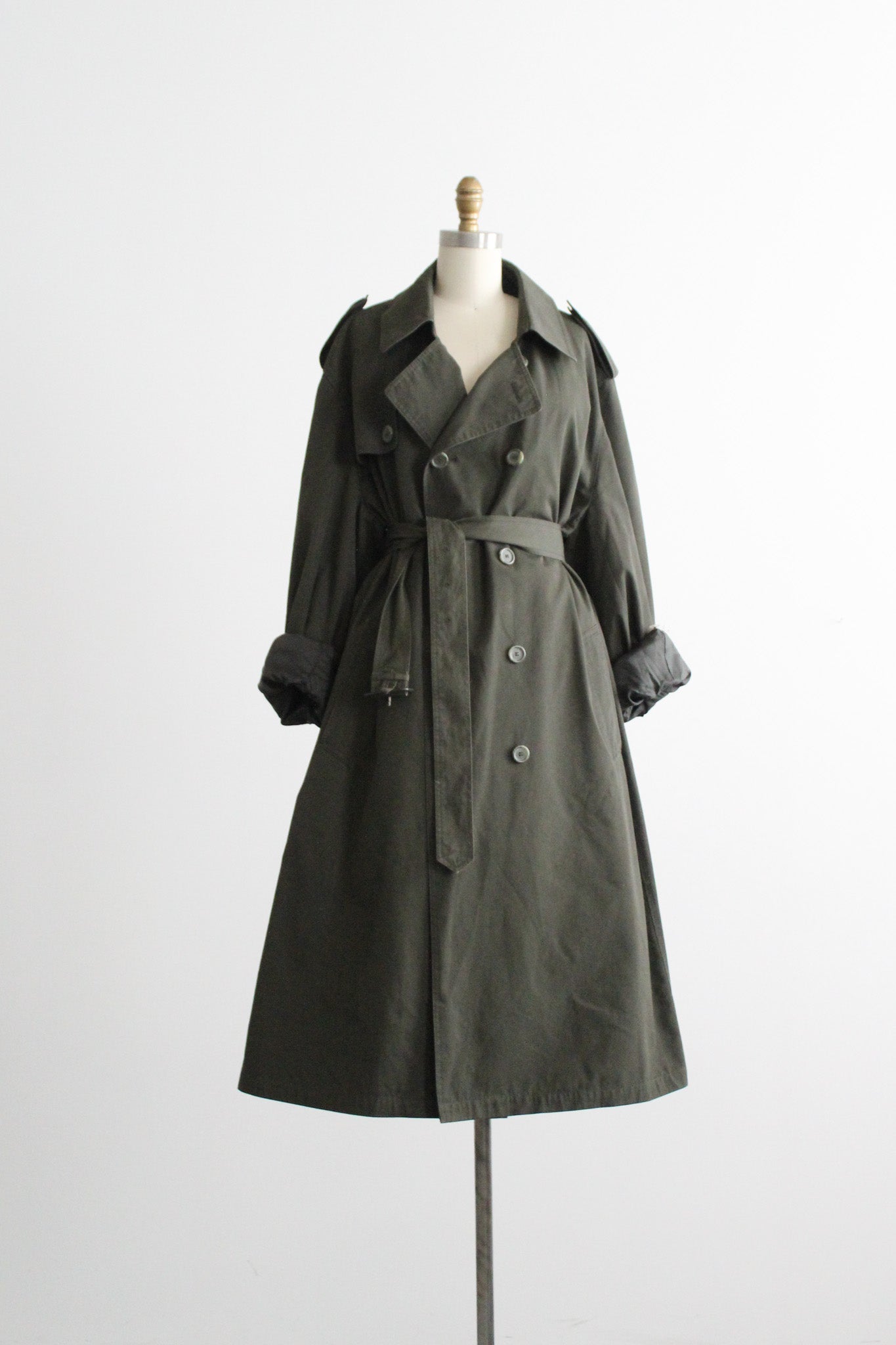 features of note: removable quilted liner / pockets at the hip / button closures / comes with a matching belt