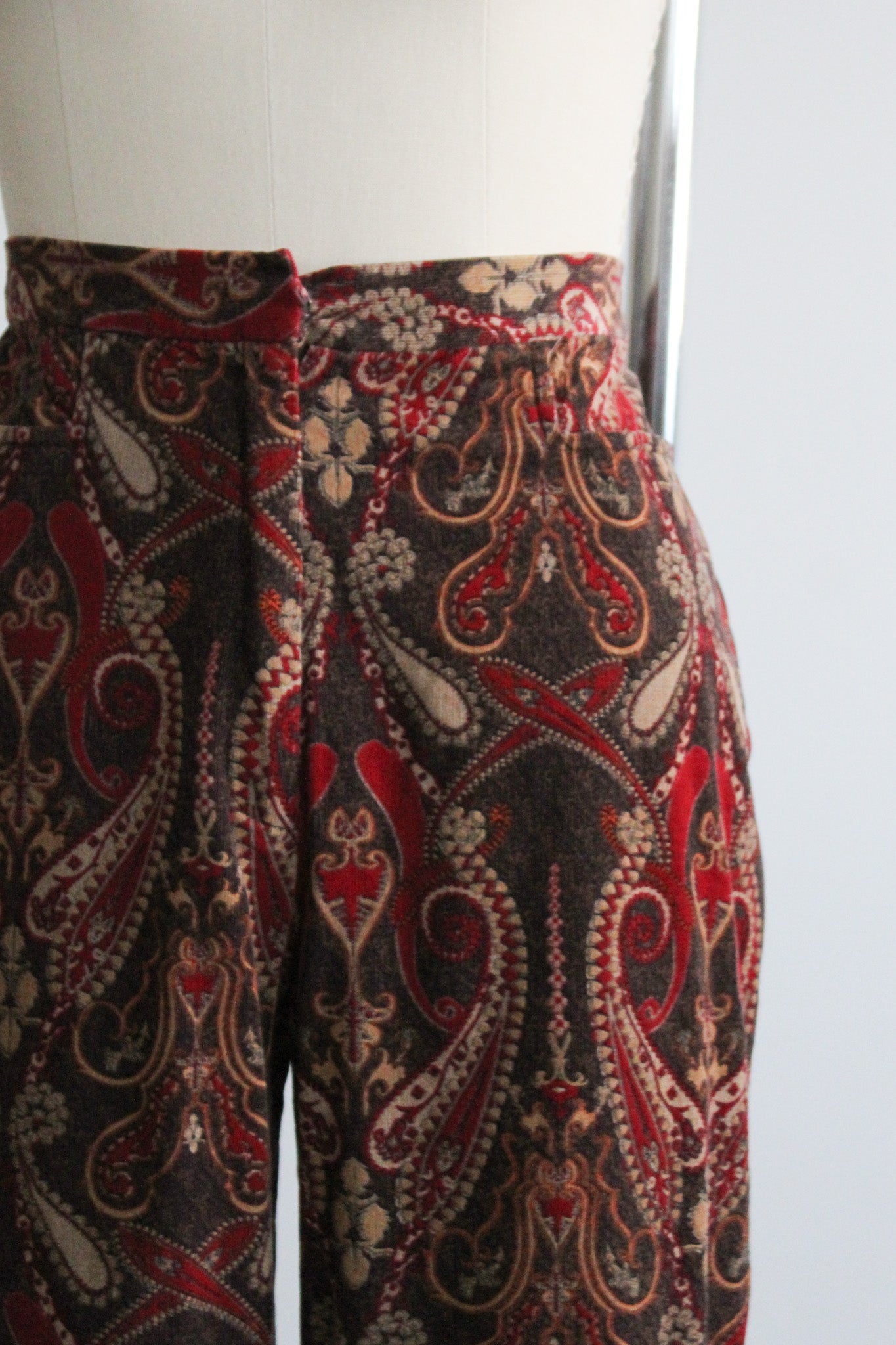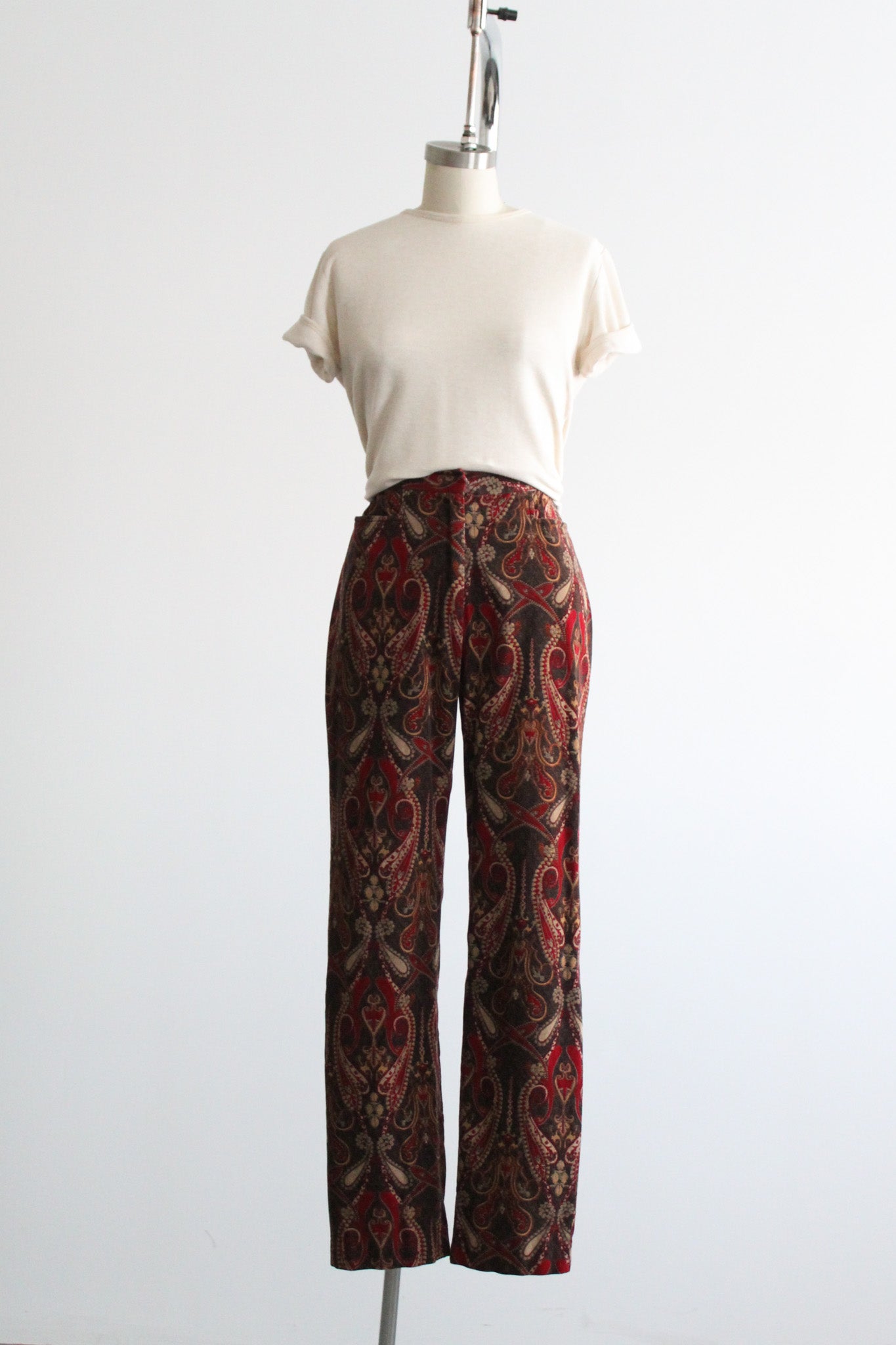 features: zip and clasp fly / pockets at the hip / corduroy with a paisley print