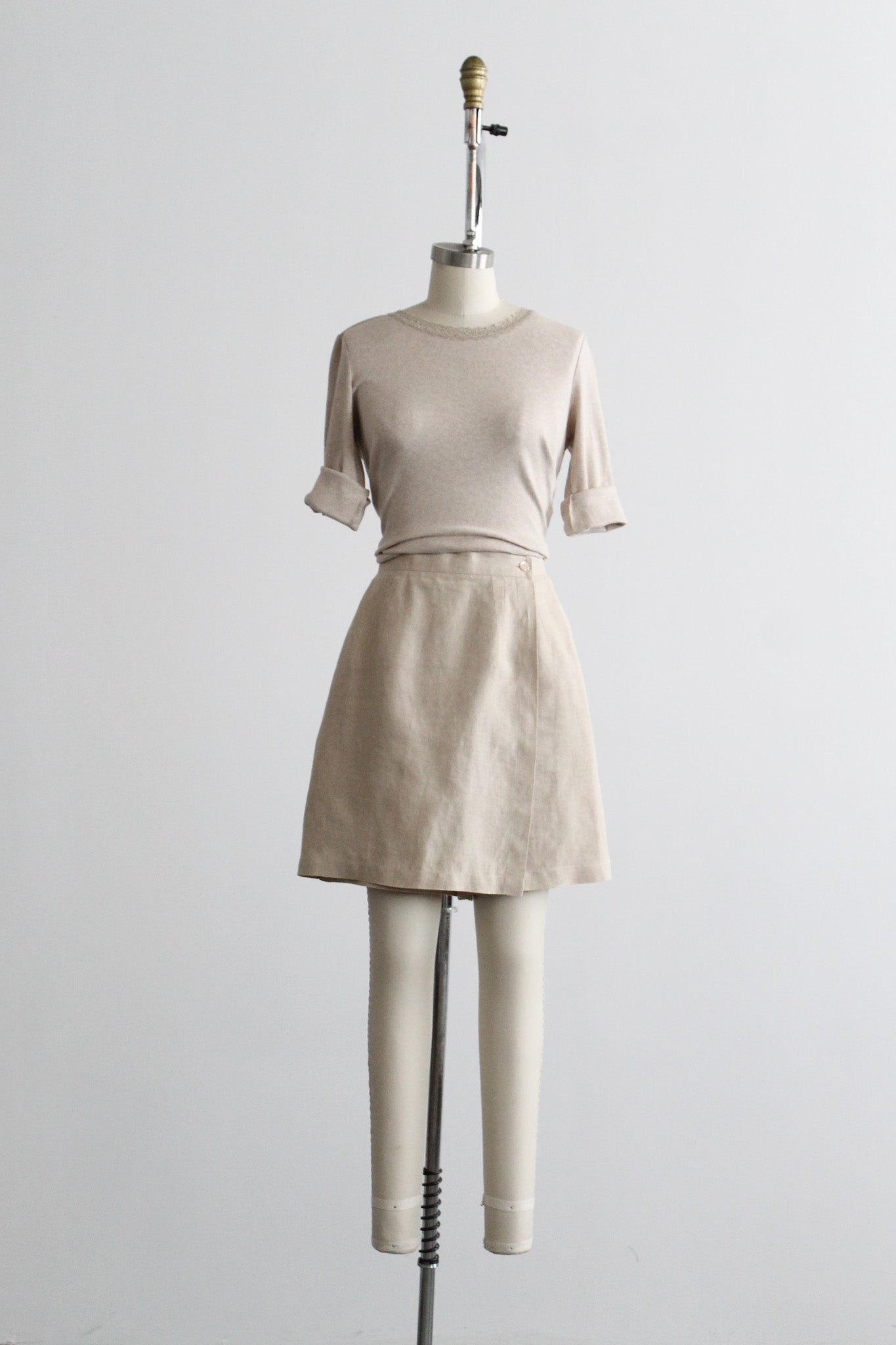 features of note: shorts underneath the skirt / wraparound shape with a button closure / pockets at the hip