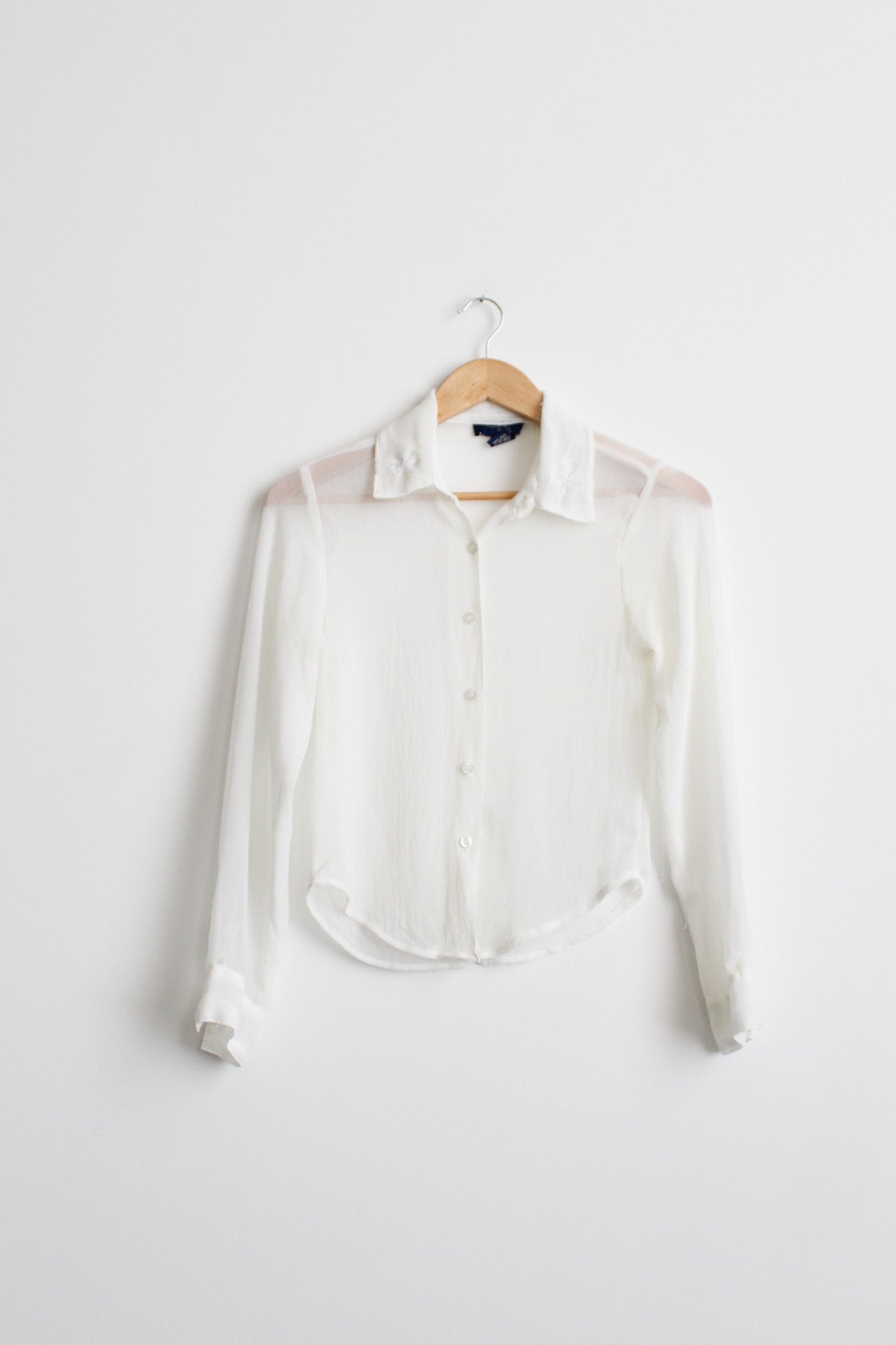 features of note: buttons all the way up the front / sheer fabric / embroidery at the collar