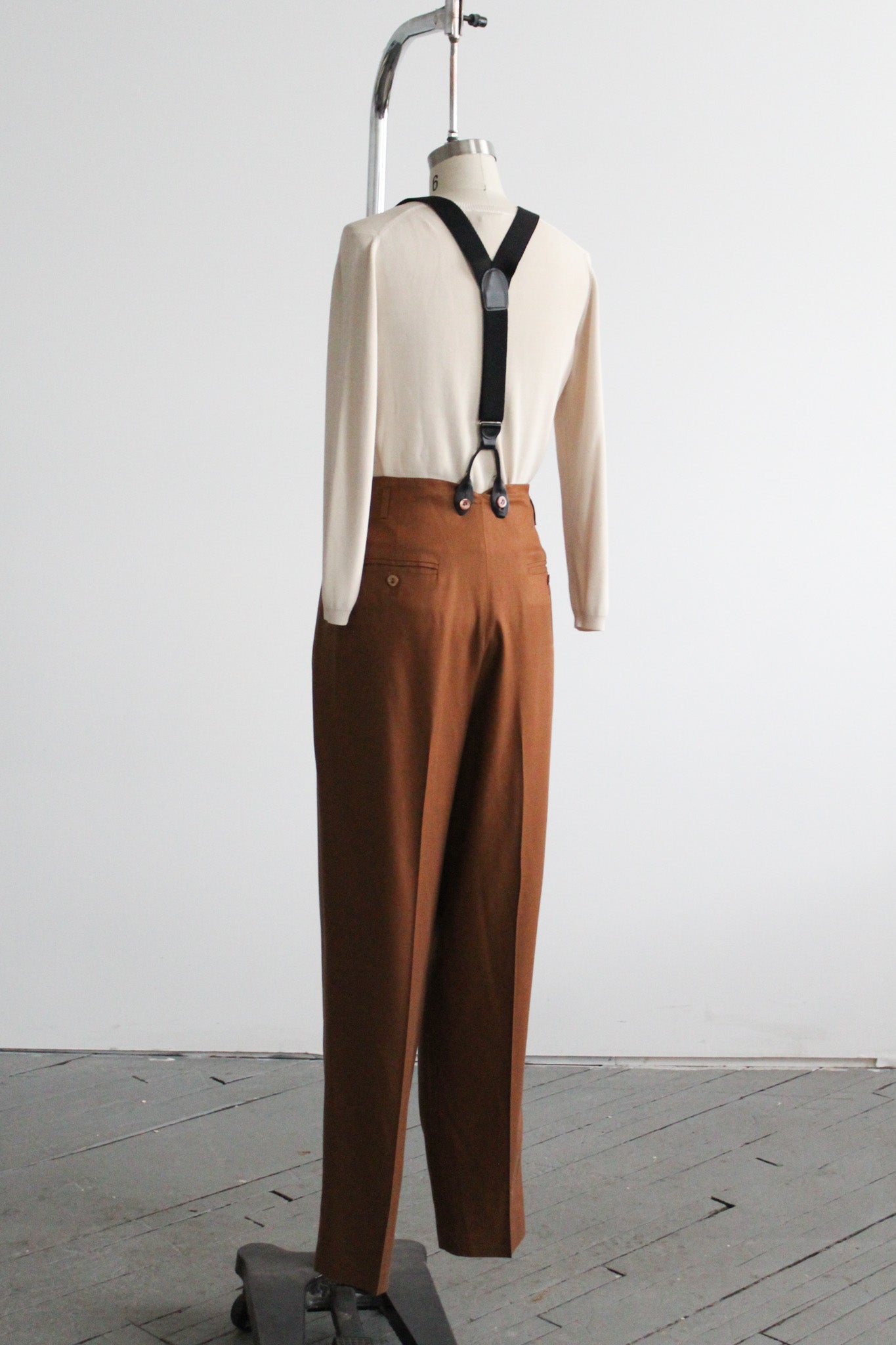 features of note: zip and button fly / pockets at the hip / detachable suspenders